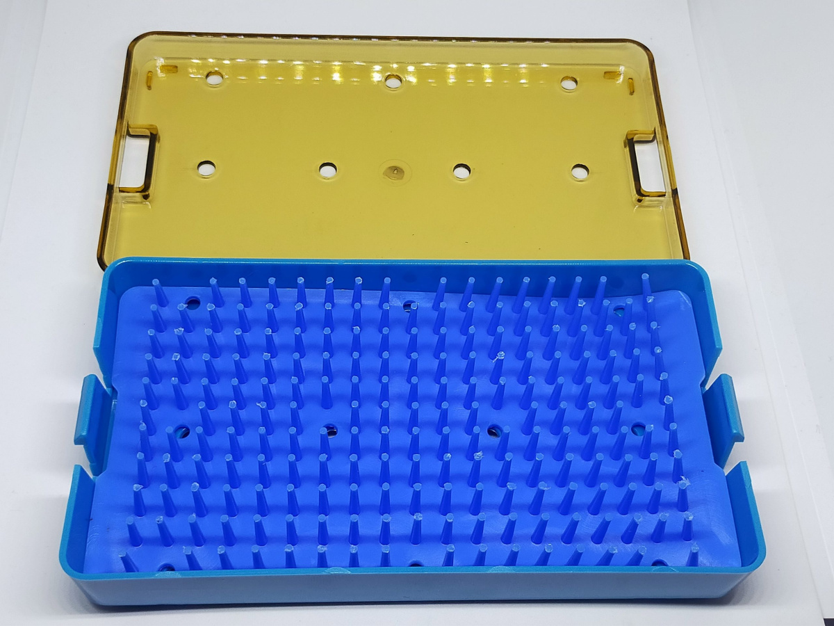 Контейнер имеет гладкую поверхность, которая легко очищается и дезинфицируется. Он также имеет отверстия для циркуляции воздуха, и слива жидкостей что позволяет быстро и эффективно стерилизовать инструменты.